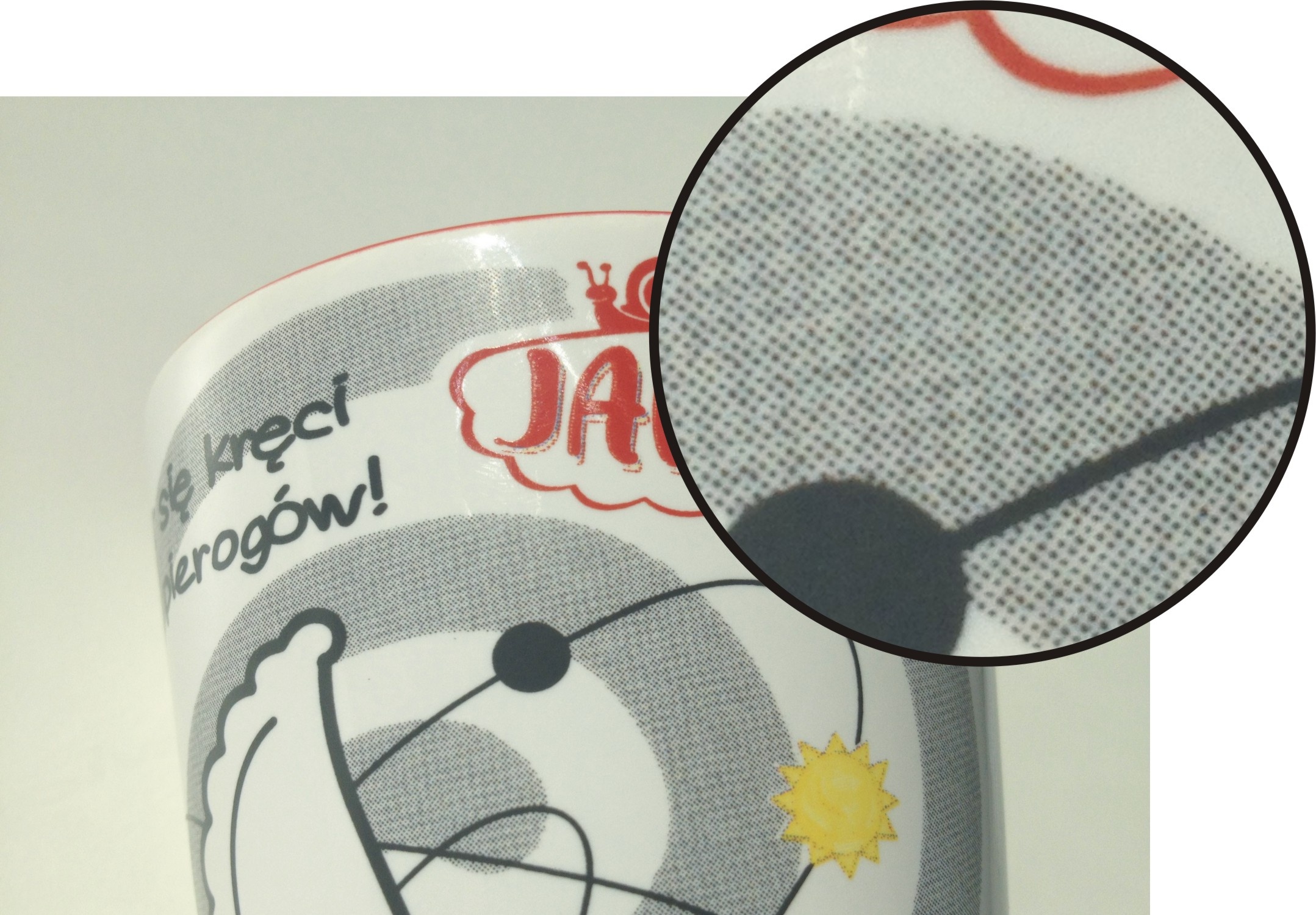 Na kubkach wykorzystujących metodę druku CMYK widoczne są charakterystyczne rastry – drobne, widoczne z bliska elementy, z których składa się cały nadruk. Rastry stają się szczególnie mocno widoczne na dużych, jednorodnych powierzchniach.